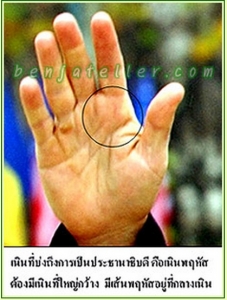 คนที่จะมีบุญมีวาสนาที่จะเป็น ผู้นำระดับประเทศ นั้น ต้องมีรูปทรงมืออย่างในภาพนี้ คือนอกจากจะมีเนื้อเนินเต็มๆแล้ว ยังต้องมีเส้นลายมือ ที่เป็นเส้นเรียบร้อย เรียว คม ชัด และที่สำคัญที่สุด ในการที่จะได้เป็นผู้นำหรือมีตำแหน่งยศศักดิ์ ถึงประธานาธิบดีแล้ว ต้องมี เนินพฤหัส ที่ใหญ่กว้าง