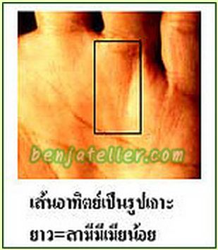 มีหลายๆท่านที่โทรมาสอบถามว่า เส้นลายมือนั้นเปลี่ยนแปลงได้จริงหรือ? และเมื่อมันเปลี่ยนแปลงได้ แล้วมันจะทำนายได้แม่นยำหรือ? เรื่องราวฉบับนี้เป็นคำตอบตัวอย่างที่ดี ของเส้นใจและเนินที่เปลี่ยนไป เปลี่ยนไปเพราะความมานะมุ่งมั่นของคนเรานั่นเอง ฉะนั้นการอ่านลายมือจึงต้องพิจารณาทั้ง 2 มือ เพื่อมาเปรียบเทียบกัน ก็จะรู้ความเป็นมาของบุคคลนั้นได้มากขึ้น ชนิดเจาะลึก ทีนี่มาดูถึงเส้นเมียหลวงเมียน้อย ที่เป็นสาเหตุให้ครอบครัวนี้ต้องบ้านแตกสาแหรกขาด พลอยเดือดร้อนไปถึงลูกๆ เรื่องของความรักก็ให้ไปดูที่เส้นอาทิตย์ตรงใต้นิ้วนาง เพราะเป็นเนินที่เกี่ยวข้องกับความรักความสมหวังของคนเรา ให้สังเกตที่เส้นอาทิตย์จะเห็นว่า เป็นเส้นที่มีรูปเกาะเป็นรูปข้าวสาร ทั้ง 2 มือ ใครก็ตามที่มีเส้นอาทิตย์มีรูปเกาะ บ่งถึงบุคคลนั้นต้องประสบกับความผิดหวังอกหัก ในตัวของคนรัก คู่ครอง หรือคู่ครองเขาหมดรักหมดอาลัยเราแล้ว จึงหนีไปมีเมียน้อย ถ้าใครมีก็ให้ระวังนะครับ ยิ่งมีเส้นอาทิตย์เป็นเกาะทั้ง 2 มือ เหตุการณ์ยิ่งเลวร้ายมากขึ้น คือไม่สามารถที่จะแก้ไขได้ เพราะถ้ามีเพียงมือเดียว ยังพอที่จะป้องกันได้ ยังพอที่จะโน้มน้าวให้เขาคืนกลับมาหาลูกหาเมีย ไม่เห็นแก่เมียก็ให้เห็นแก่อนาคตของลูก เพราะผู้ชายบางคนเหม็นเบื่อเมีย แต่กลับรักลูกสุดหัวใจก็มีมากราย เรียกว่าถ้าเส้นอาทิตย์มีรูปเกาะแค่มือเดียวจะเป็นมือไหนก็ได้ ยังพอมีโอกาสให้สามีกลับคืนมาได้ครับ และอิทธิพลของเส้นอาทิตย์ที่เป็นเกาะทั้ง 2 มือ จึงทำให้ชีวิตรักต้องจบลงแบบน่าสงสารน่าเวทนา ความรักจึงมีอานุภาพมากมายมหาศาล สามารถเปลี่ยนแปลงจิตใจของผู้คนได้ขนาดนี้ แต่ใครเล่าเป็นผู้ก่อเหตุขึ้น