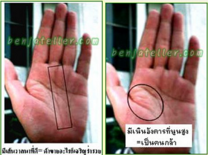 บ่งบอกถึงการมี พลังชีวิต ที่เต็มเปี่ยม โดยเฉพาะที่เนินศุกร์และเนินอังคารในนั้น เป็นเนินที่เต็มไปด้วยเนื้อจนนูนล้นออกมา ทั้ง ๒ เนิน จึงทำให้เขาเป็นคนกล้า ไม่กลัวใคร เรียกว่ากล้าจนบ้าบิ่น มีหรือที่เป็นพ่อค้าแต่กับไปมีเรื่องกับตำรวจ เรียกว่าไม่บ้าก็เมาแล้ว แหละนี่คืออิทธิพลของ เนินอังคารใน ที่หนุนส่งให้เป็นคนที่มีจิตใจเด็ดเดี่ยวกล้าหาญ ประกอบกับการที่ มีเส้นใจที่ไม่เป็นเกาะไม่แตกเป็นพู่ ปลายเส้นใจเดินตรงเข้าไปเนินพฤหัส เส้นลักษณะนี้เป็นเส้นใจที่ดีที่สุด ของวิชาหัตถศาสตร์ น้อยคนที่จะมี เป็นการบ่งบอกถึง ถ้าได้ตัดสินใจจะทำอะไรแล้ว จะทำให้สำเร็จ ถึงแม้จะมีอุปสรรคมากมายขนาดไหนก็ตาม ก็จะสู้ไม่ถอย การทำมาหากินของเขาจึงมีแต่เจริญรุ่งเรือง