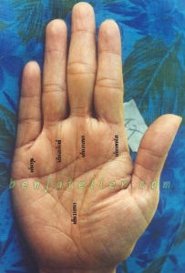 เส้นประจำเนิน เนินนี้กลับไม่มีเส้นศุกร์ ส่วนมากจะมีเส้นขวางเกิดขึ้น มีทั้งเส้นยาวและเส้นสั้น ถ้าคนที่มีเส้นขวางมากๆ บ่งถึงเป็นคนที่เครียดวิตกมากเกินไป แต่ถ้ามีเครื่องหมายตาตะแกรงเกิดขึ้นที่เนินนี้แล้ว จะเป็นสิ่งที่เลวร้ายต่อสภาพครอบครัวมาก ยิ่งถ้าเกิดอยู่ในมือสตรีเพศแล้ว จะบ่งถึงบ้านแตก สาแหรกขาดได้ เนื่องจากตัวเองไม่สามารถ สนองตอบ ในเรื่องทางเพศให้กับคู่ครองได้