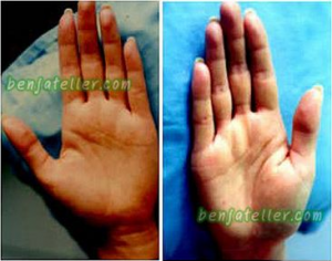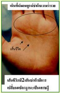 ส่วนที่มือซ้ายได้มีเส้นที่ผิดปรกติที่เส้นชีวิต จะเห็นว่าเส้นชีวิตเมื่อเดินได้สักระยะหนึ่งก็ขาดหายไป แต่ได้มีเส้นชีวิตอีกเส้นหนึ่งได้เกิดขึ้นตรงใต้เส้นสมองแล้วเดินยาวแทนเส้นที่สั้นเส้นแรก เรียกว่ามีเส้นชีวิตถึง 2เส้น!? แปลกนะครับที่มีเส้นชีวิตถึง2 เส้น แล้วมันแปลว่าอะไร เส้นชีวิตเส้นแรกที่เดินมาแล้วขาดหายไป แสดงถึงมีการเปลี่ยนแปลงวิถีชีวิตอย่าง พลิกล๊อก ชนิดหน้ามือเป็นหลังมือ เรียกว่าเคยเป็นคนธรรมดาสามัญชนได้กลับกลายเป็นเศรษฐีมีเงินทองเป็น 1,000 ล้าน 10,000 ล้าน!! แล้วจะรู้ได้อย่างไรว่า คุณปุ๋ย ต้องเปลี่ยนแปลงไปในทางที่ดี จะเปลี่ยนไปแบบยาจกขอทานไม่ได้หรือ? ที่รู้นั้นไม่ใช่หวยออกแล้วมาใบ้กัน ไม่ใช่ครับ เพราะหลักฐานมันมีให้เห็นๆอยู่ เรื่องความร่ำรวยของคนเรานั้น ในทางหัตถศาสตร์สามารถดูได้ที่รูปทรงมือ คือให้พิจารณาความหนาบางของฝ่ามือโดยเฉพาะที่เนินด้านบนของฝ่ามือตรงเนินเสาร์และเนินอาทิตย์ ซึ่งเห็นได้อย่างเด่นชัดว่า ที่มือซ้ายนั้น ตั้งแต่เนินพฤหัสไปถึงเนินพุธนั้น เป็นเนินที่เต็มสวยทุกเนิน นี่คือหลักฐานที่บ่งบอกว่า คุณปุ๋ย ต้องเปลี่ยนฐานะเป็นเศรษฐี