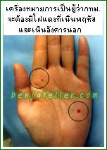 แต่ถ้าถามว่าคนที่จะได้เป็นผู้ว่าฯนั้น บนฝ่ามือจะต้องมีเครื่องหมายอะไร ขอตอบว่า จะต้องมี ไฝแดง ขึ้นที่เนินอังคารนอกและที่เนินพฤหัส แต่ถ้าเนินพฤหัสไม่มี ไฝแดงก็ต้องมีเส้นพฤหัสที่เป็นสีแดงๆ เพราะเนินพฤหัสเป็นเนินที่เกี่ยวกับตำแหน่งหน้าที่การงาน หรือเรื่องของยศถาบรรดาศักดิ์ จึงต้องมีเครื่องหมายที่ดีอยู่บนเนินนี้ คนที่จะเป็นผู้ว่าฯ จึงต้องมีเครื่องหมายดังกล่าวนี้ครับ และที่สำคัญ เส้นอายุ ของคนนั้น จะต้องอยู่ที่เนินทั้ง ๒ นี้พอดี จะเป็นเนินใดเนินหนึ่งก็ได้