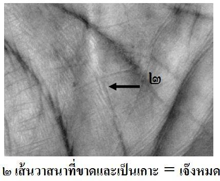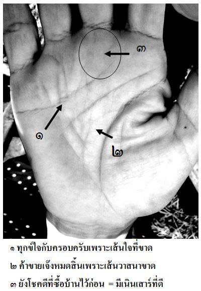จะเห็นว่าเส้นวาสนาของคุณป้ารายนี้ เป็นเส้นวาสนาที่ขาดทั้ง๒มือ!!? ที่มือซ้ายวิ่งมาถึงกลางฝ่ามือก็ ถูกเส้นขวางมาตัดจนขาดหายไป แถมปลายเส้นยังเป็นเกาะอีก เส้นลักษณะนี้บ่งถึงเรื่องของการทำกิน เรื่องของเงินทองได้สูญเสียจนหมดสิ้นแล้ว เรียกว่าการค้าเจ๊งหมดแล้ว!!? เพราะที่มือขวาก็เป็นแบบนี้ เมื่อเป็นทั้ง๒มือก็ไม่สามารถที่จะแก้ไขเปลี่ยนแปลงแล้ว คุณป้าเล่าว่า การค้าของที่บ้านได้ล่มจมหมดแล้ว ครอบครัวทั้งสามีลูกเต้าหนีหายไปหมด ยังโชคดีนะที่เอาเงินมาซื้อบ้านหลังนี้ไว้ก่อน ไม่งั้นป้าไม่รู้จะไปอยู่ที่ไหน!!