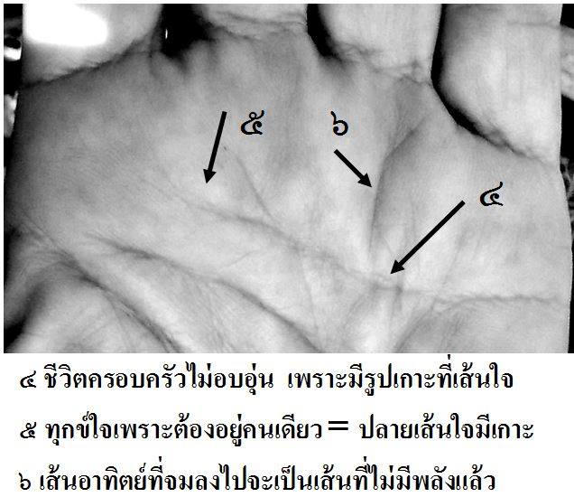 จะเห็นว่าที่เส้นใจตรงใต้เนินอาทิตย์เป็นเส้นที่ชำรุด ได้ขาดเกยกัน ส่วนที่มือซ้ายเป็นเกาะใหญ่ที่เนินแห่งความรักเช่นกัน เป็นการบ่งบอกว่า จะเสียใจช้ำใจกับคนรักที่จากไป ที่ทำนายเช่นนี้เพราะว่า เนินอาทิตย์เนินที่อยู่ตรงใต้นิ้วนาง เป็นเนินที่ใช้ดูถึงเรื่องความรักหรือความสำเร็จสมหวัง เมื่อเส้นใจมาชำรุดที่เนินนี้ก็บ่งถึงเรื่องความรักจะทำให้เสทือนใจอย่างใหญ่หลวง เรียกว่าจิตใจจะทุกข์เศร้ากับเรื่องนี้มากๆ มากจนเส้นใจถึงกับขาดจากกัน มากจนมีรูปเกาะขึ้นมาอยู่ที่เนินแห่งความรัก