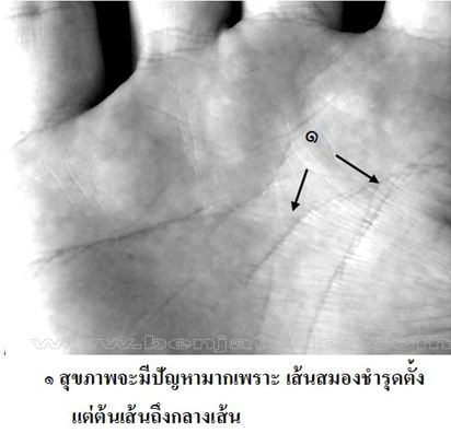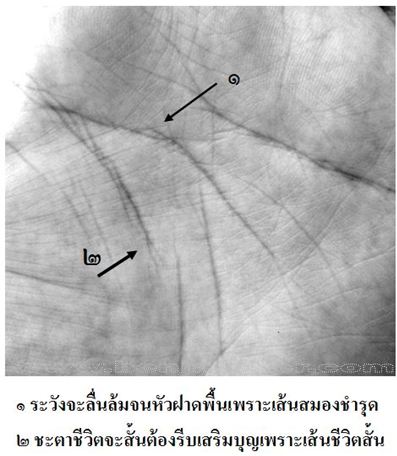 ผมดูเครื่องหมายต่างๆบนฝ่ามือแล้ว เห็นแล้วไม่ค่อยดีเลย โดยเฉพาะเรื่องสุขภาพจะมีปัญหามาก มากจนกระทบกับชะตาชีวิตได้ เพราะเส้นชีวิตในมือซ้ายของเสี่ยหนุ่มรายนี้ สั้นจนน่าเป็นห่วง เส้นสมองก็ชำรุด !! เฮ้อ จะเตือนเขายังไงดีนะ แต่ดีนะที่มีแม่เขามาด้วย ถ้าเด็กหนุ่มมาเองจะไม่ค่อยเชื่อหรอก ยิ่งเด็กสมัยนี้ท่องมนต์สวดมนต์บางบทยังไม่ได้เลย น่าเห็นใจๆ และถ้าให้ไปสะเดาะห์ปล่อยปลาปล่อยสัตว์หรือไปถวายสังฆทานยิ่งไม่เชื่อใหญ่ เพราะเห็นว่าเป็นเรื่องงมงายไร้สาระ !?