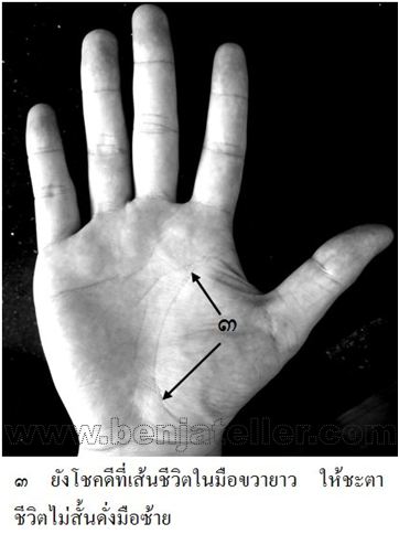เรามาดูเส้นชีวิตที่มือขวาบ้างจะเห็นว่าเป็นเส้นที่ยาวปรกติ ไม่สั้นแบบมือซ้าย เรียกว่ายังโชคดีพอจะมีทางแก้ไขได้ เพราะถ้าเส้นชีวิตที่มือขวาสั้นแล้ว เสี่ยหนุ่มรายนี้จะโชคร้ายแน่ เมื่อมือขวาไม่สั้นมันมีทางแล้วครับ ผมเลยบอกว่าให้ไปหาหลวงพ่อวิชัย เขมิโย ท่านจะบอกวิธีเสริมชะตาต่ออายุให้ ไปหาท่านให้ได้