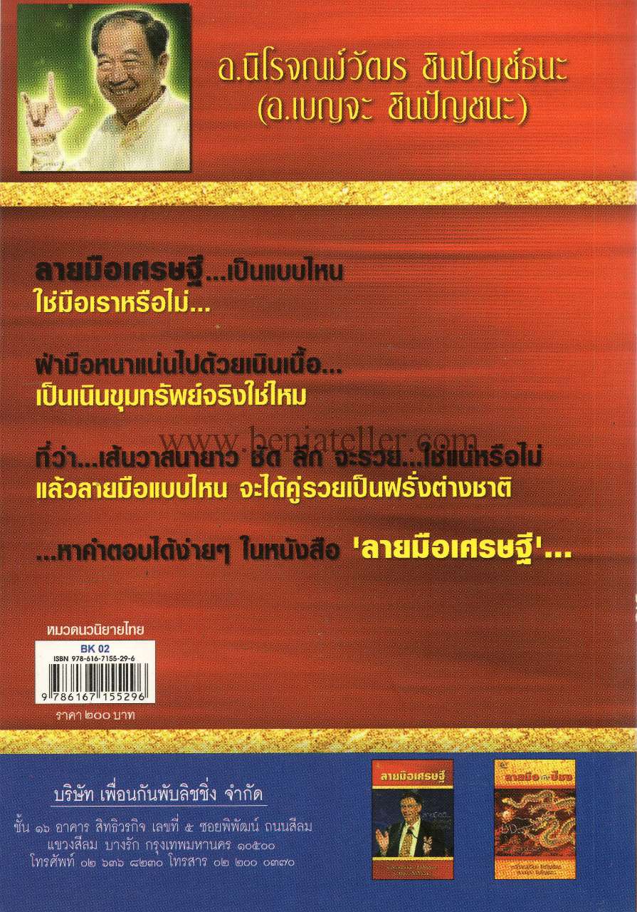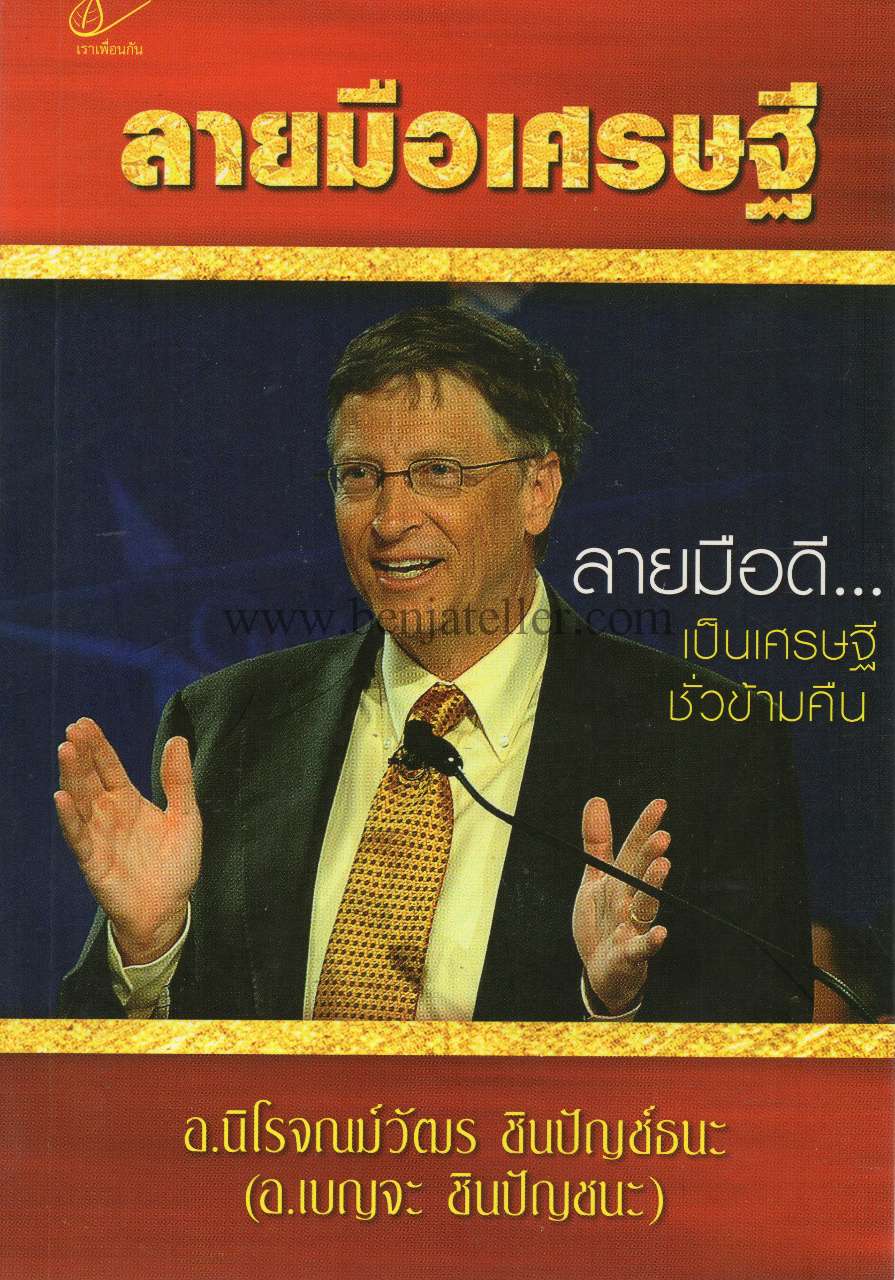 เขาร่ำรวยมาได้อย่างไร เขายากจนเพราะอะไร…. ลายมือเศรษฐี เล่มนี้ว่าด้วยลายมือที่จะทำให้คนร่ำรวยเป็นเศรษฐี หรือบอกถึงว่าทำไมบางคนจึงยากจนอย่างปฏิเสธความจริงไม่ได้ อาทิ คนที่เคยร่ำรวยเป็นเศรษฐีมาก่อน แต่ภายหลังกลับกลายเป็นคนจนๆ เงินแค่พันบาทก็ไม่มี ในมือเขามีเส้นอะไรที่บ่งบอกถึงเรื่องนี้ หรือคนดังทั้งหลายอย่าง ภรณ์ทิพย์ นาคหิรัญกนก ชูวิทย์ กมลวิศิษฎ์ สมบัติ เมทะนี หรือแม้แต่ลายมือของเศรษฐีหมื่นล้านอย่างบิลเกตท์ หนังสือเล่มนี้ได้ให้คำตอบแก่ท่านอย่างชัดเจน ที่ผู้เขียนตั้งใจเขียนอย่าง จริงจังไม่ปิดบังเพื่อจะให้เป็นหนังสือ หัตถศาสตร์เล่มเดียวที่สมบูรณ์ที่สุด