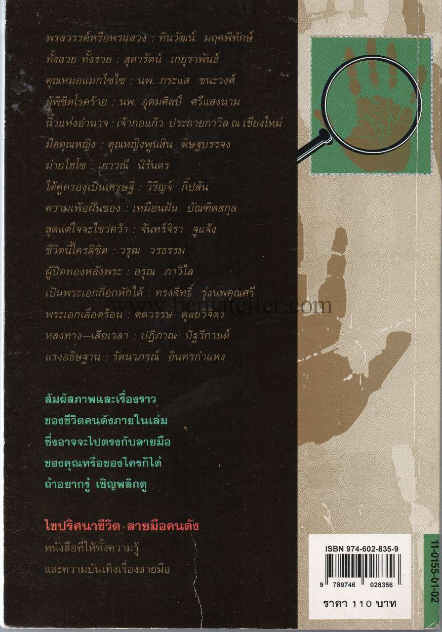 เป็นเล่มต่อเนื่องจากเรื่อง เจาะลึก…ลายมือคนดัง ของ อ.เบญจะ ชินปัญชนะ โหราจากที่ผ่านการดูลายมือมากว่า 20 ปี ภาพในเล่มบรรยายภาพและคำทำนาย จากลายมือคนดังร้อยเรียงเป็นอักษรให้ทราบถึงเรื่องราวชีวิตของคนดังที่ อาจจะไปตรงกับลายมือของ ใครบางคนก็ได้ใครจะไปรู้